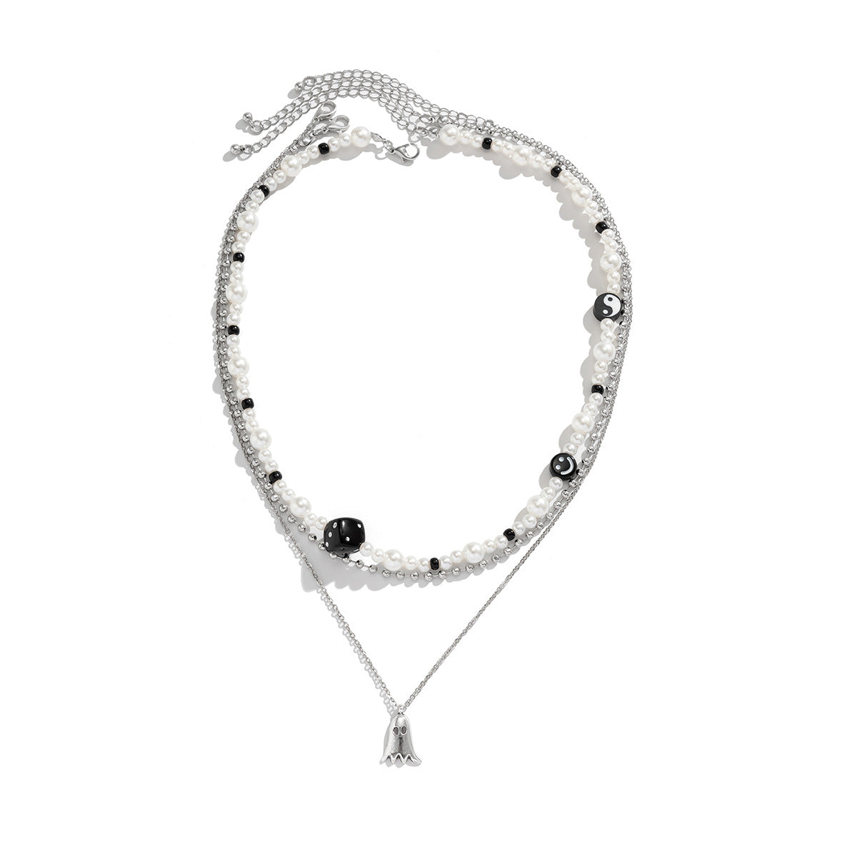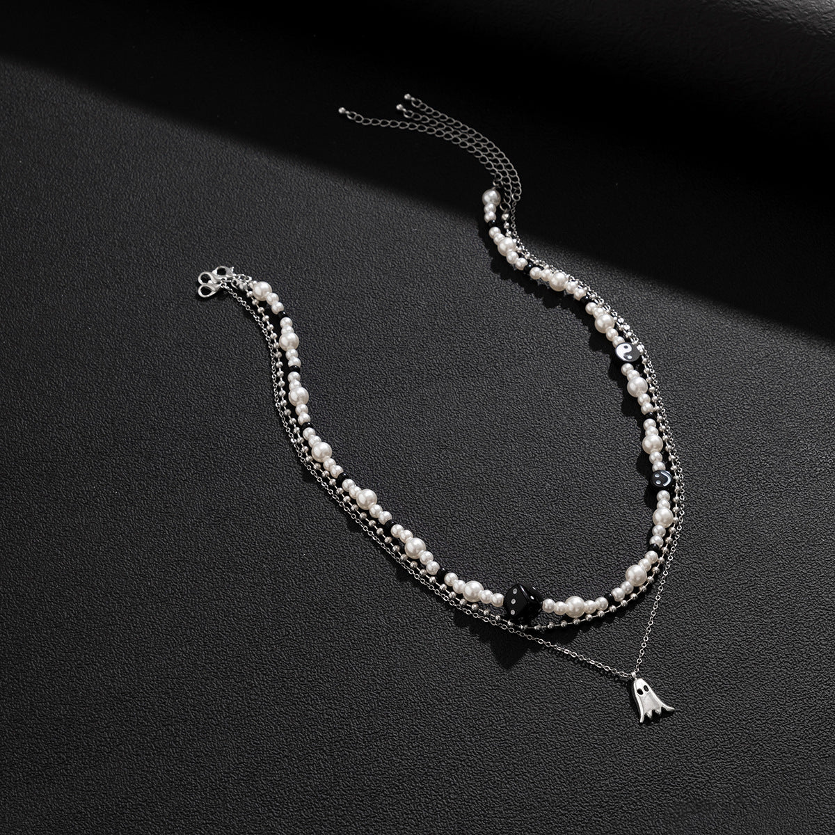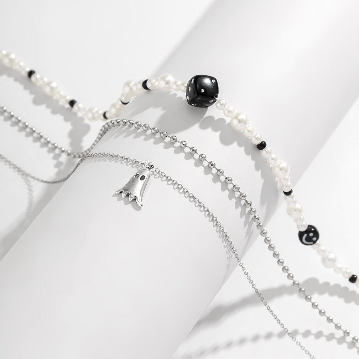 This multi-layer stackable design necklace set of fresh and modern pearls with smiley face, dice design, simple rice bead chain and delicate ghost pendant is a statement and unique combination of accessories. The following is a description of the design concept for the necklace set: