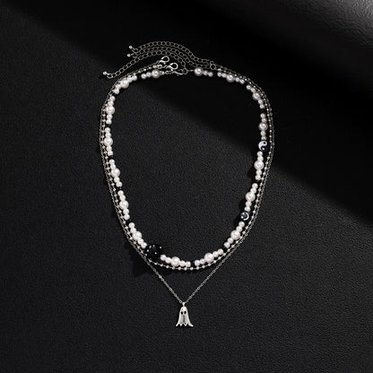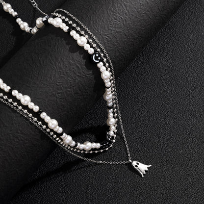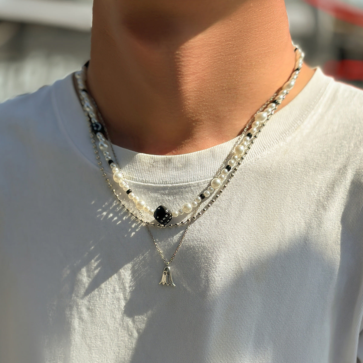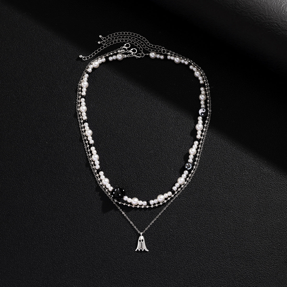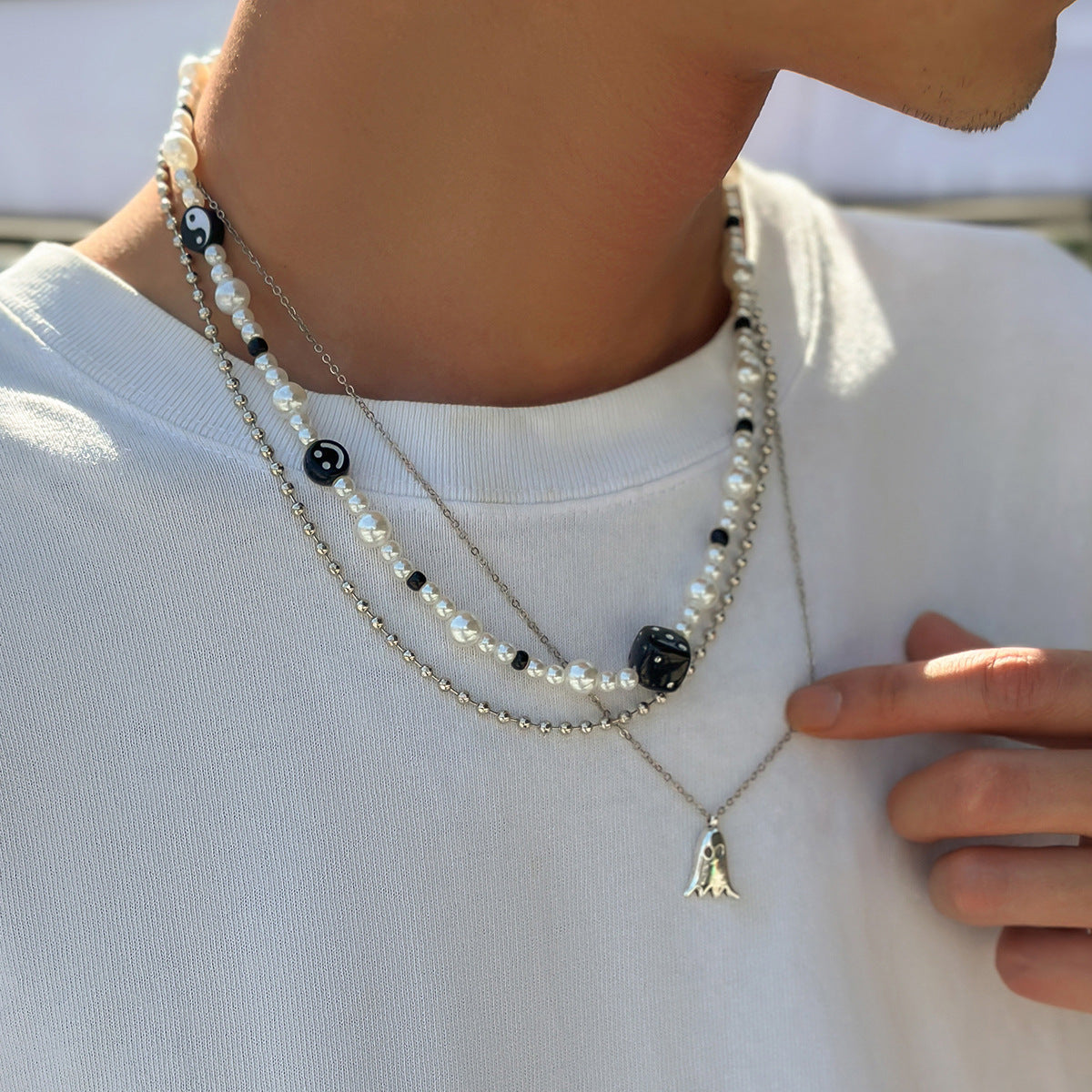 This multi-layer stackable design necklace set of fresh and modern pearls with smiley face, dice design, simple rice bead chain and delicate ghost pendant is a statement and unique combination of accessories. The following is a description of the design concept for the necklace set: